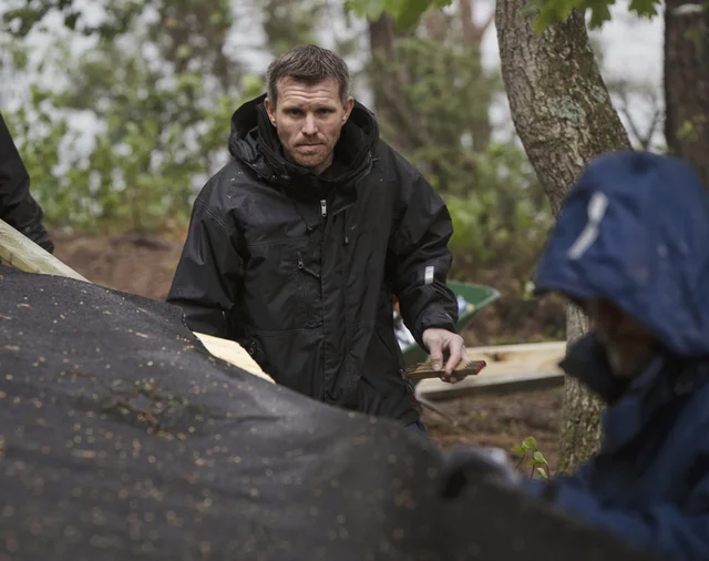 Kurz bevor der Regen einsetzt, gelingt es den Männern, das letzte Stück Dachpappe anzubringen. Zum Glück für sie, denn nun kann sich die Gruppe im Unterstand vor dem Regen schützen und das Mittagessen genießen, das Fredrik Andersson vorbereitet hat. Fredrik Andersson ist von Göteborg nach Sätila umgezogen und ist beeindruckt von dem lokalen Engagement in dem kleinen Dorf.