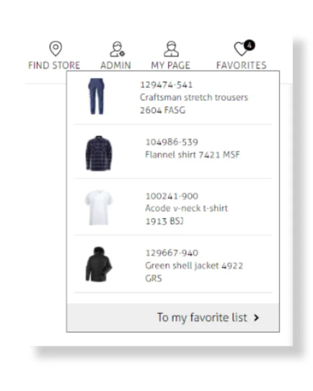Go to your favorite list by clicking on "Favourites" placed next to the shopping cart. Then click on "To my favorite list" to proceed.