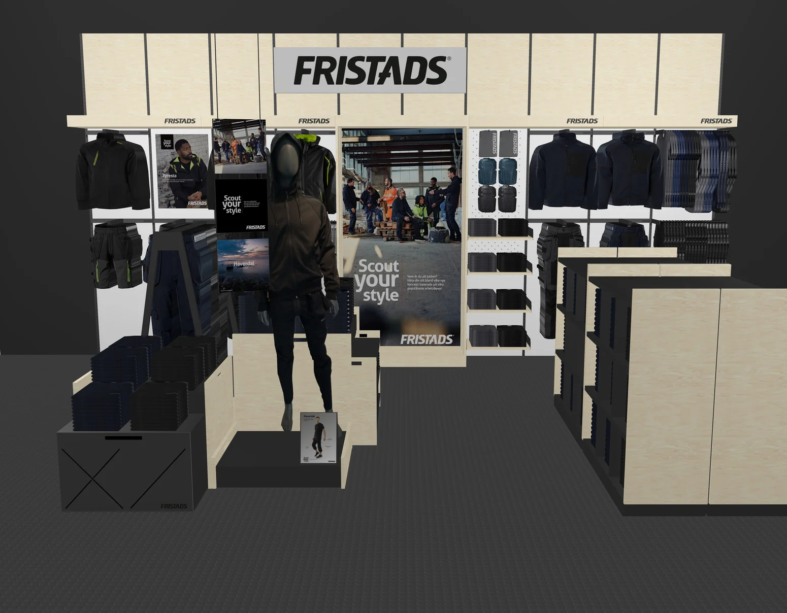 Fristads’ Shop in Shop comprises different wall and floor modules that are arranged to create an inviting, well-flowing space that optimises exposure of the garments. We offer three packages – Small, Medium and Large – depending on the size of your store, how much space you would like to dedicate to your Fristads products and which type of products you carry. Since the opportunities for customisation abound, our visual merchandiser will help you through the process every step of the way.