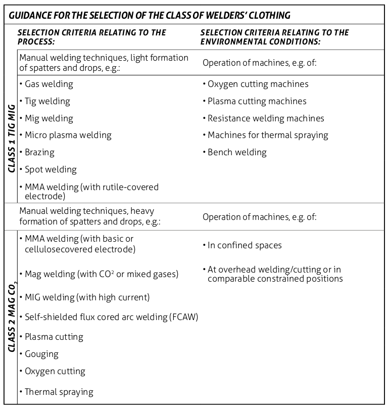 The table provides guidance on which welding class your clothes need. The material must be able to withstand at least 15 drops of molten metal without exceeding an increase in temperature of 40°C on the reverse side of the material causing skin burns.