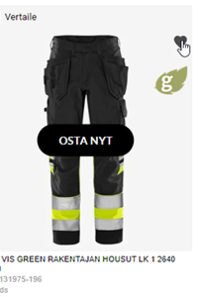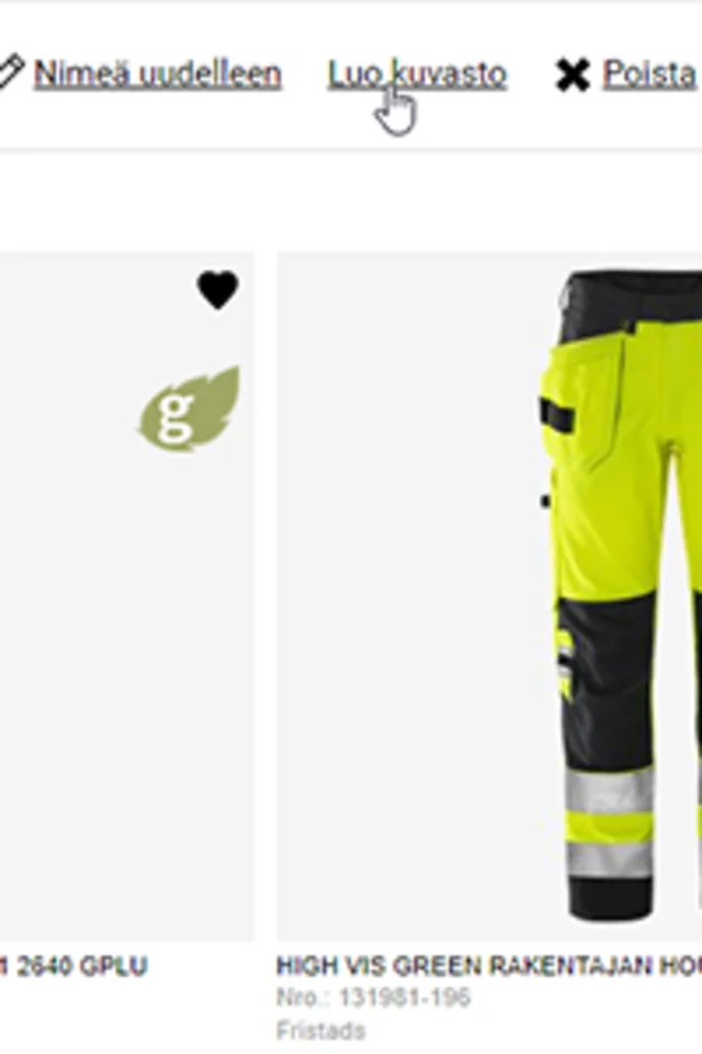 Täppää sydän aktiiviseksi kaikista niistä tuotteista, jotka haluat lisätä kuvastoon. Tuote siirtyy näin suosikkeihin- valikoituu kuvastoon.