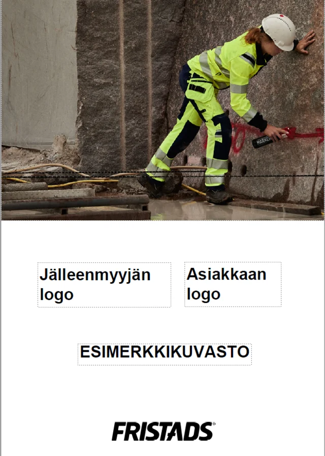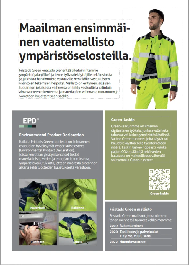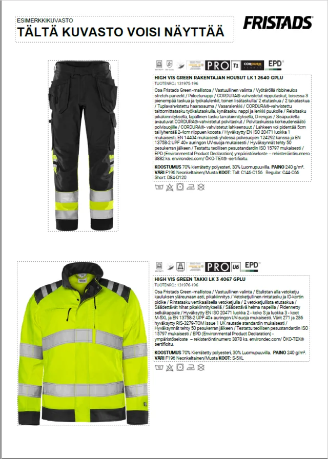 Kuvastoon on mahdollisuus lisätä kokotaulukko, Fristads Green tietosivu sekä koonti kuvaston tuotteista.