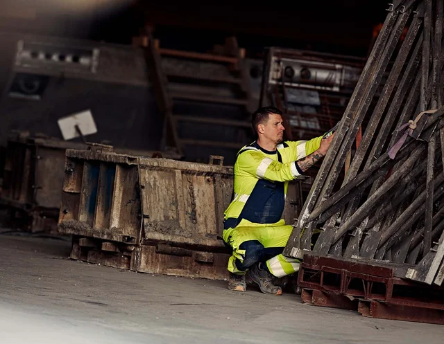 Fristads sirkulære fibre er laget av brukt arbeidstøy som er samlet inn og behandlet i en sertifisert gjenvinningsprosess. For å lage et sirkulært materiale blandes resirkulerte fibre med nye fibre og spunnes til garn, som enten veves eller strikkes til nytt stoff. Vi utviklet vårt første kommersielle produkt laget av 15 prosent sirkulære fibre i 2023 og jobber kontinuerlig med å finne nye måter å bruke våre sirkulære fibre på.