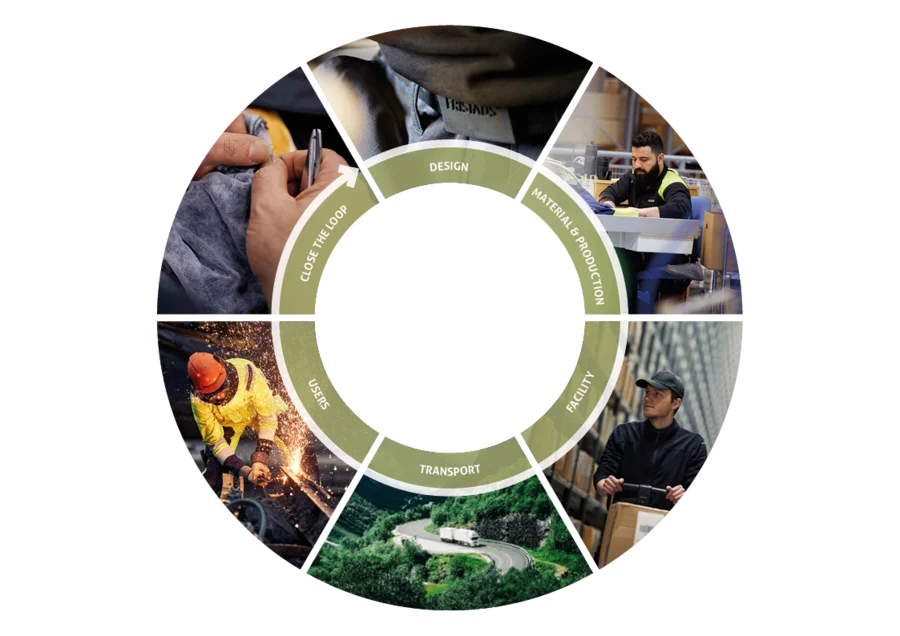 Bij Fristads gebruiken we een levenscyclusanalyse (LCA) om ons te helpen bepalen welke gebieden vanuit het oogpunt van duurzaamheid verbeterd kunnen worden. Voor elk nieuw kledingstuk dat wordt geproduceerd, bekijken we welke invloed het heeft op het milieu en wat we kunnen doen om de negatieve effecten te minimaliseren. Alle Fristads afdelingen laten zich leiden door de LCA, omdat deze het kader vormt voor onze milieu-inspanningen. Onze LCA omvat zes onderdelen: Ontwerp, Materiaal en productie, Faciliteiten, Transport, Gebruikers en "Close the loop".