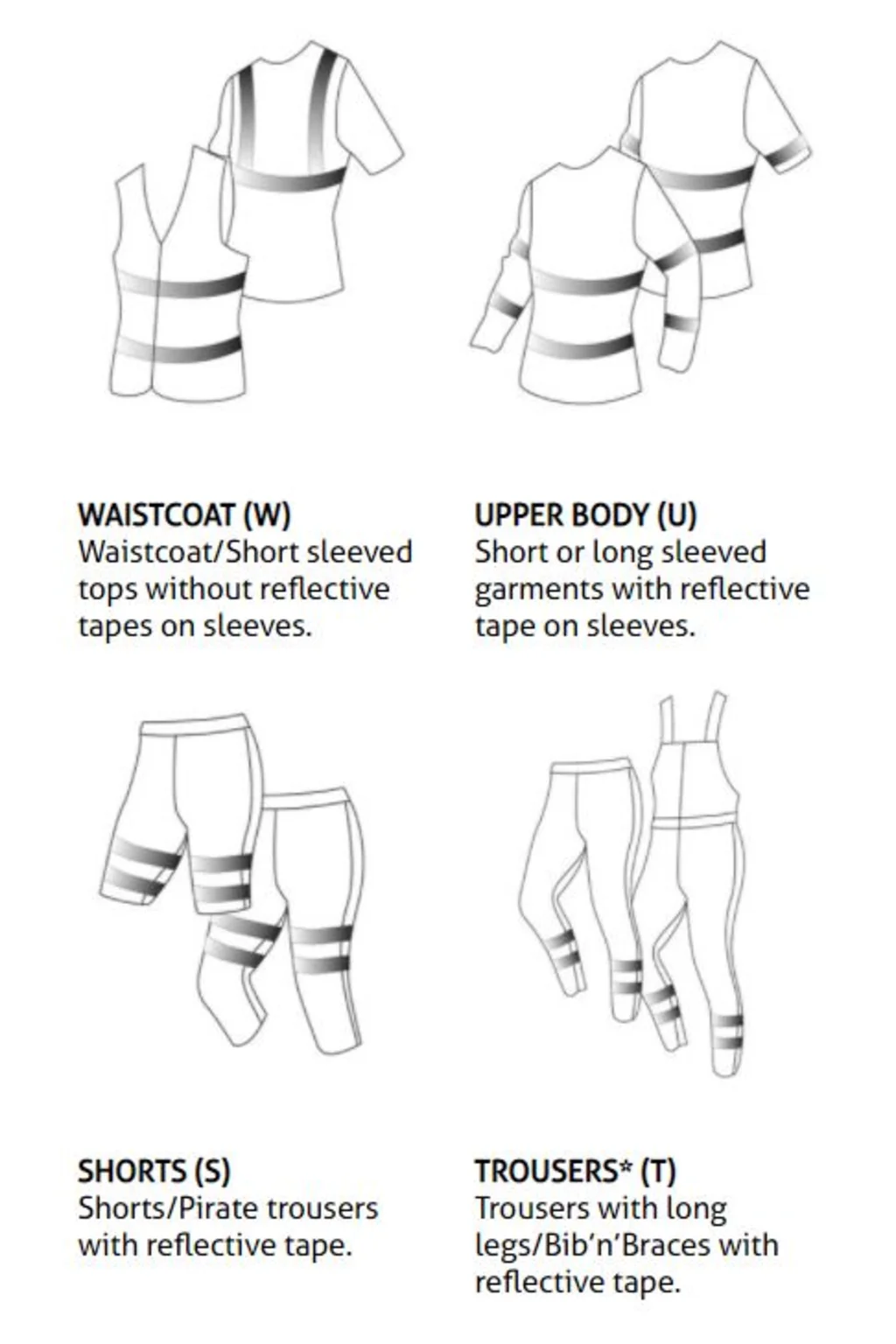 Każdemu elementowi odzieży przypisany jest kod, który zależy od rodzaju odzieży oraz wielkości fluorescencyjnej i odblaskowej powierzchni. Kod ten znajduje się na odzieży lub w informacji o produkcie poniżej każdego artykułu na stronie fristads.com. Korzystając z tabeli poniżej, możesz łatwo sprawdzić, jaką klasę bezpieczeństwa uzyskasz, łącząc spodnie (T) lub szorty (S) z kurtką, bluzą lub t-shirtem (T) albo kamizelką (W). Zobacz także poniższy film, aby uzyskać bardziej szczegółowe wyjaśnienie.