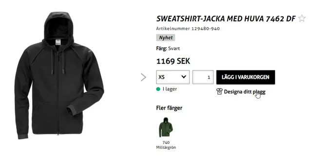 Plagg som är märkta med funktionen ”Designa ditt plagg” i webshopen kan tryckas och profileras. Du hittar funktionen under knappen för att lägga en produkt i varukorgen.