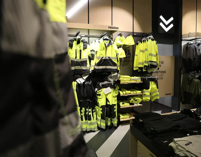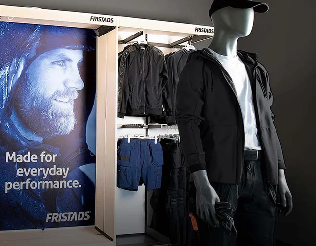 Genom att få kunden att känna sig hemma ökar du chansen till köp. Klä några skyltdockor i Fristads-kläder och arrangera dem med tillbehör som verktyg och byggmaterial för att skapa en inspirerande display. Dra uppmärksamhet till skyltningen och lyft detaljer i produkterna genom att klä skyltdockorna i färgglada plagg. Häng svarta exemplar av plaggen i närheten för att göra det lättare för kunden att hitta dem. Använd även en kombination av allmänbelysning och punktbelysning för att förstärka exponeringen av produkterna.